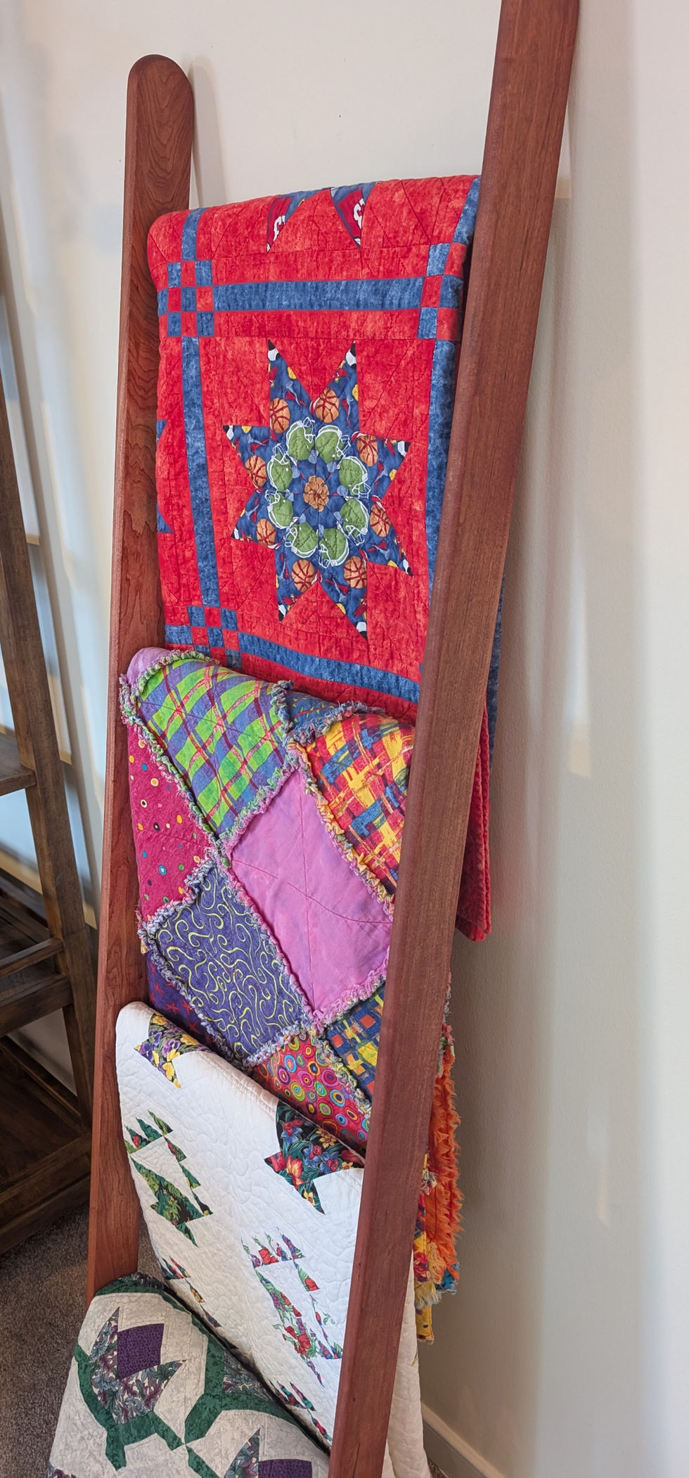 This ladder rack is for displaying handmade quilts. Made from cherry, this ladder rack provides a natural and elegant touch to any space, allowing your quilts and blankets to take center stage. Perfect for adding a color accent to a bare wall, this display rack complements and emphasizes the beauty of the quilts.